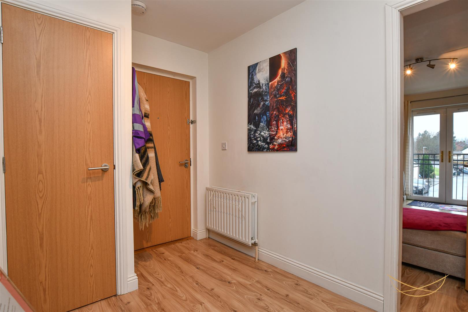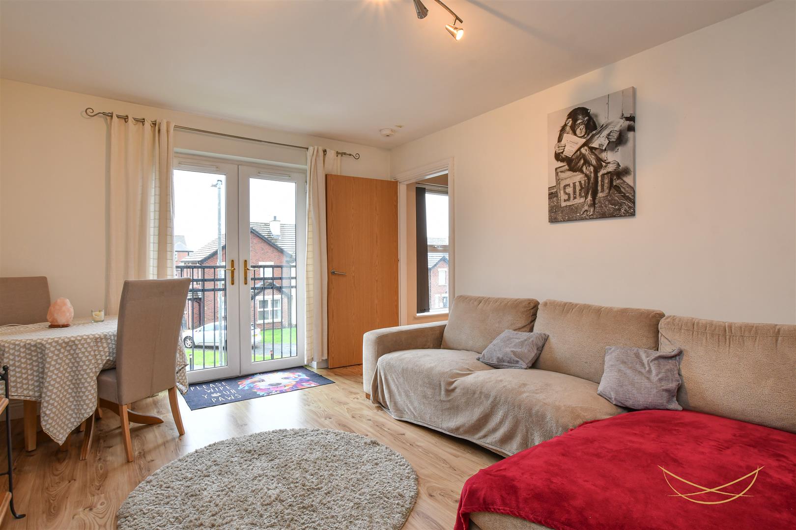 Laminate wood effect flooring. French doors.