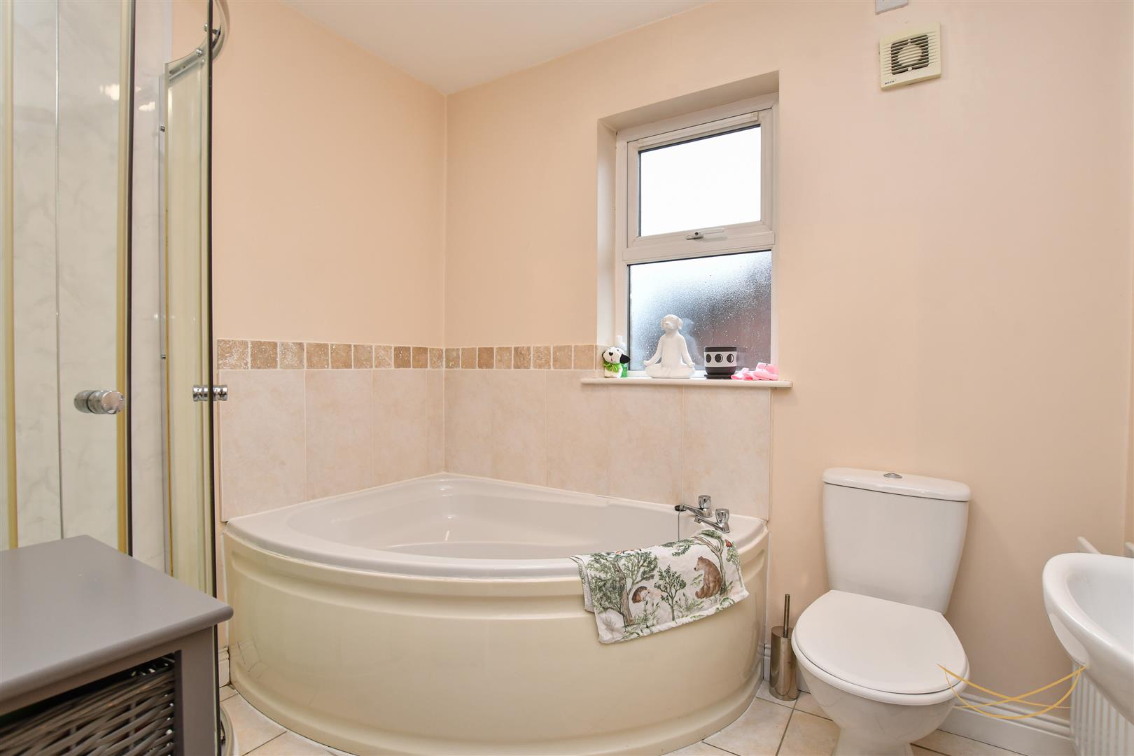 White suite comprising paneled corner bath with mixer taps. Enclosed mains shower. Low flush W/C. Tiled flooring. Partially tiled walls.
