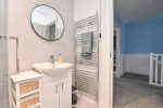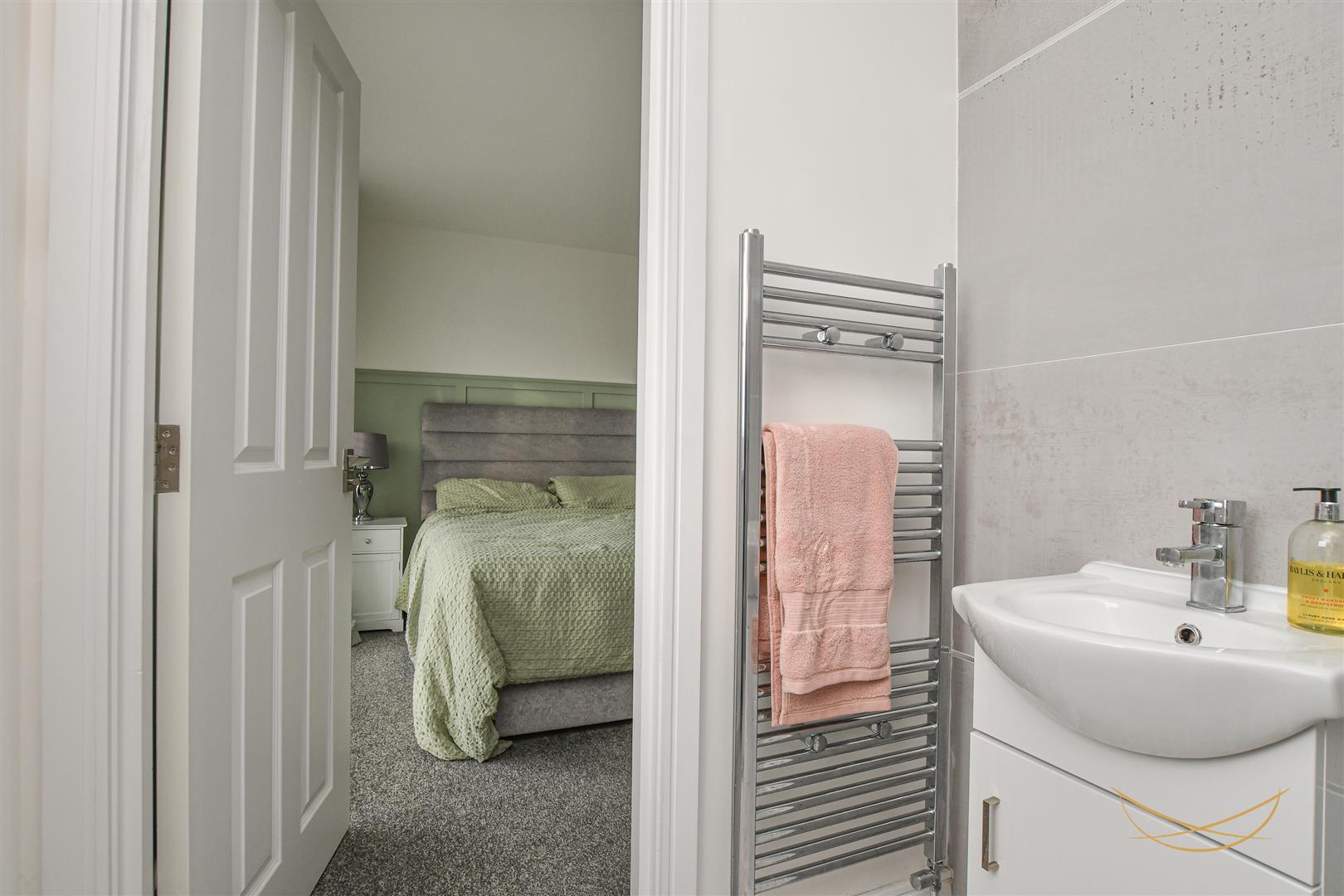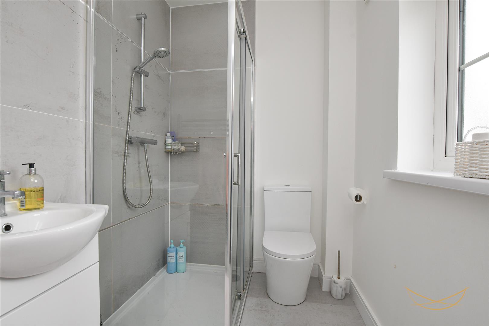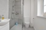 White suite comprising fully enclosed shower unit. Low flush W/C. Vanity style sink unit with mixer taps. Heated chrome towel rail. Tiled flooring. Tiled splashback.