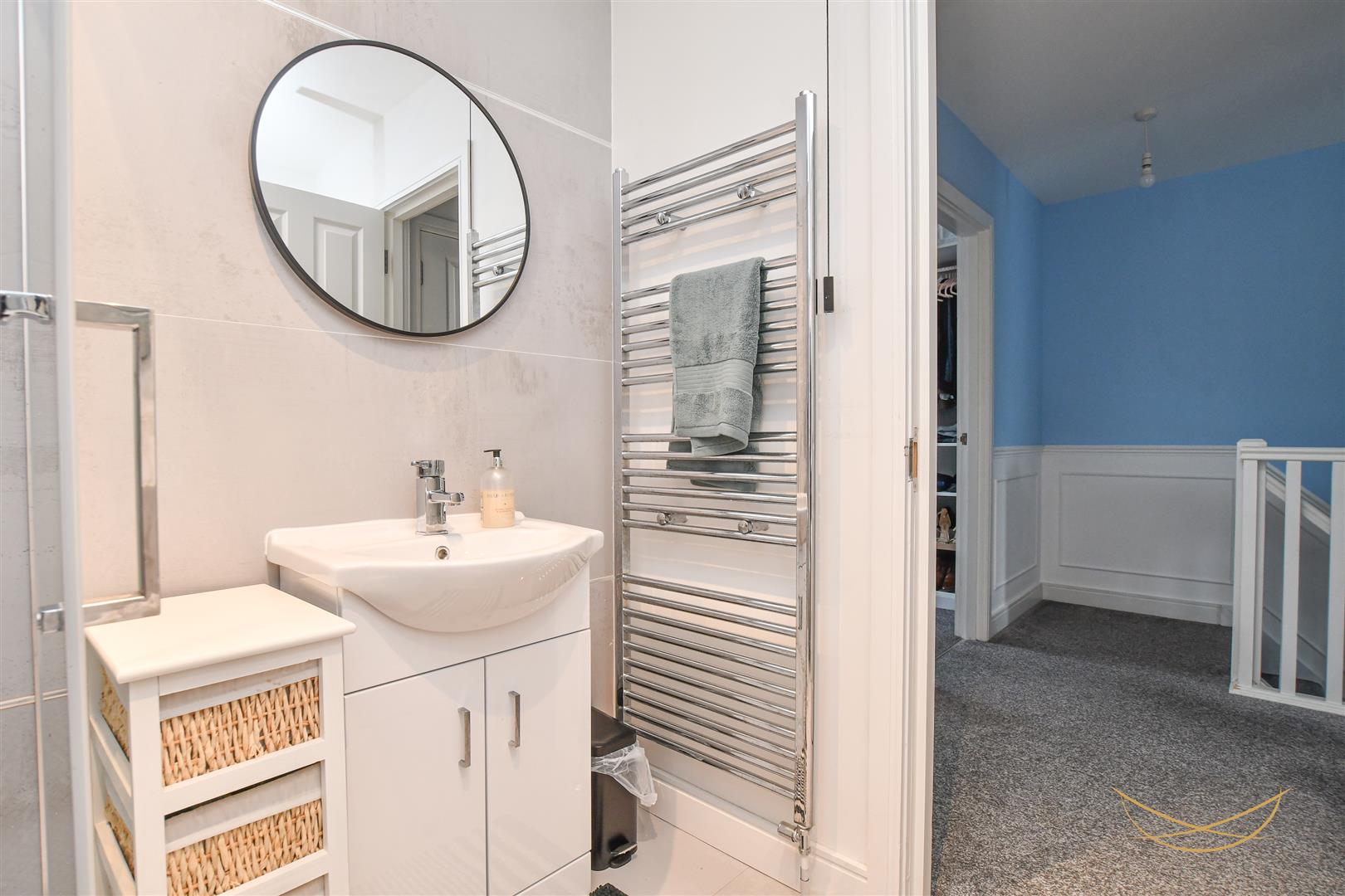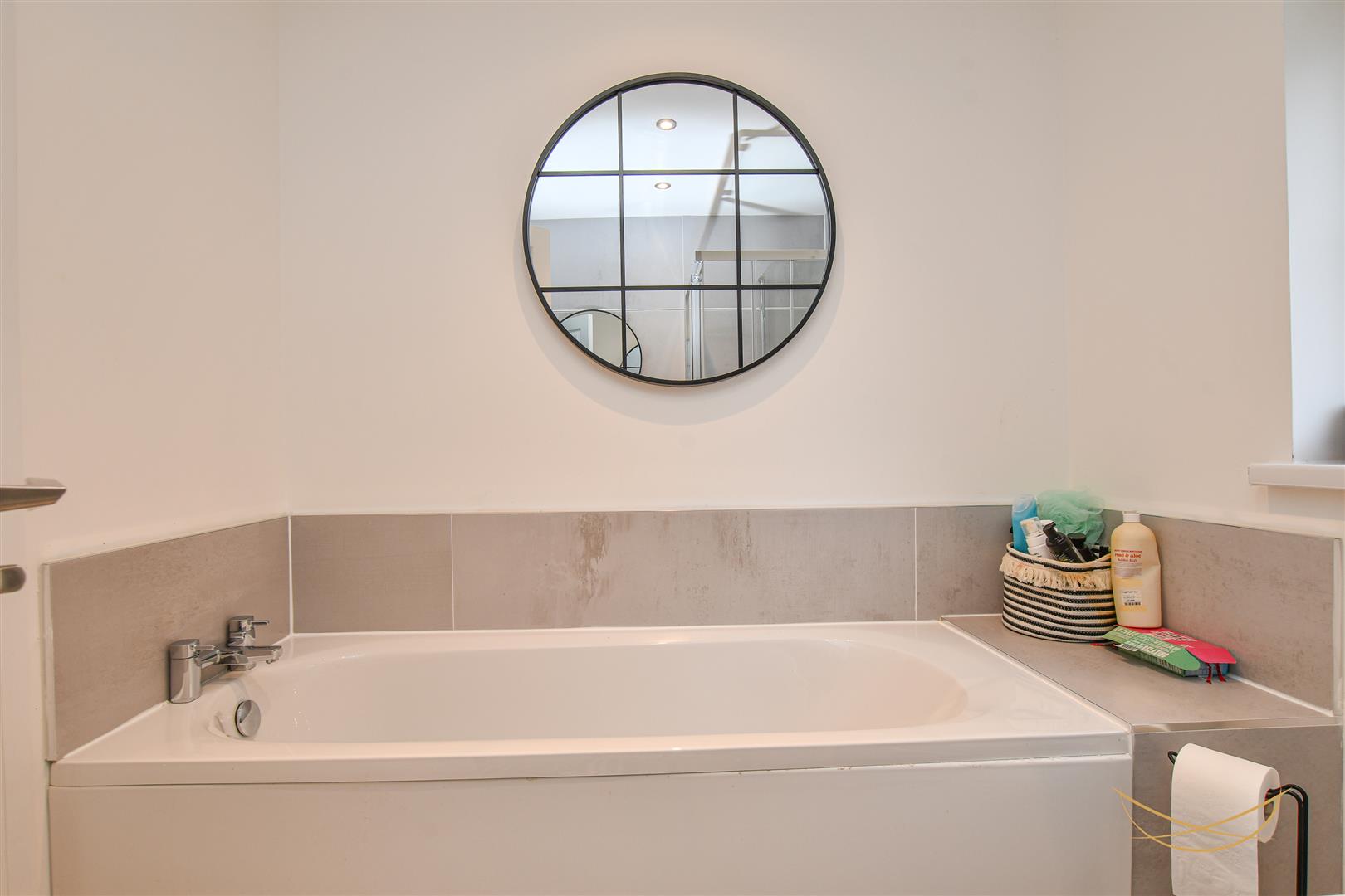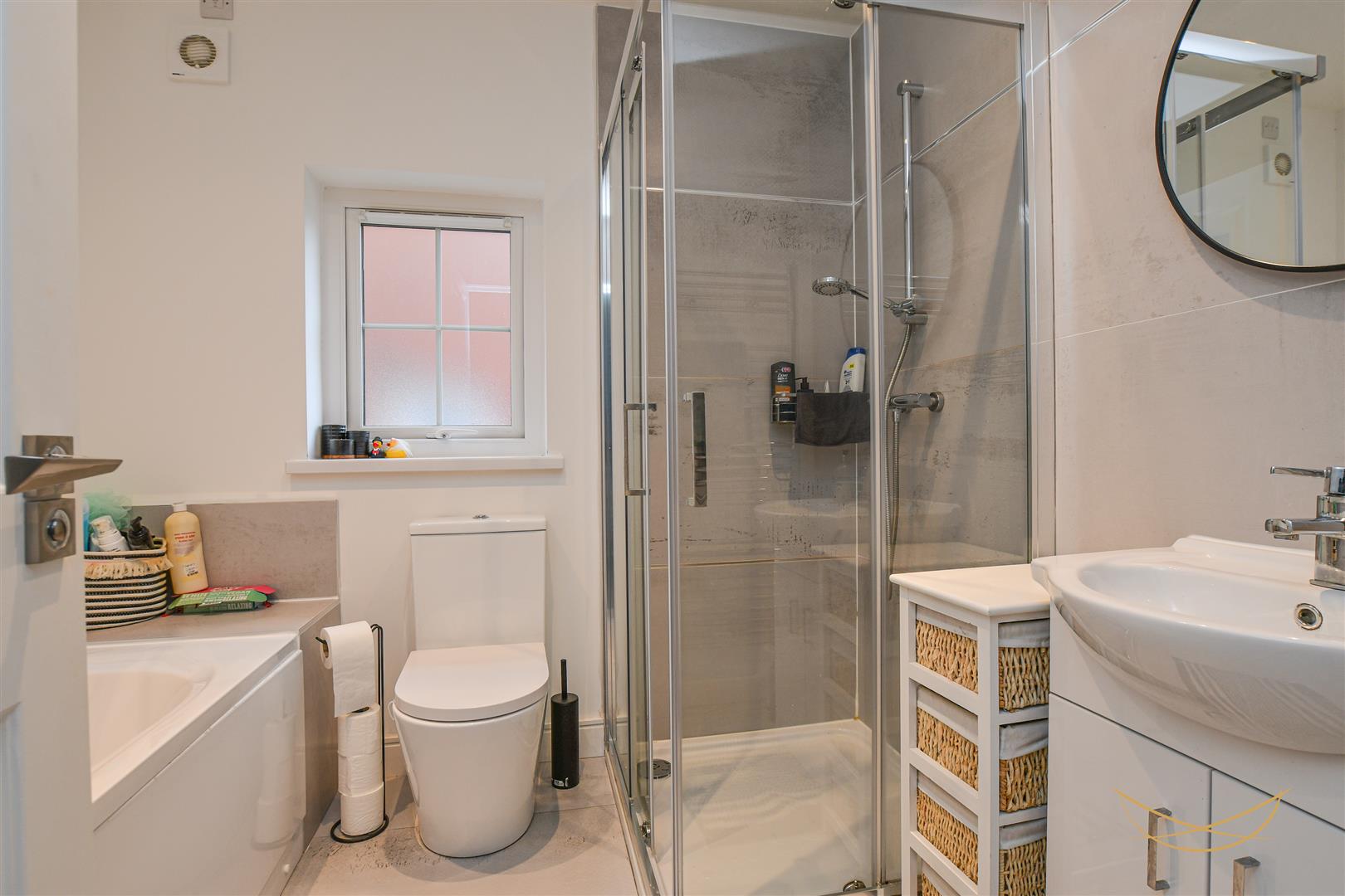 White four piece suite comprising paneled bath with mixer taps. Fully enclosed shower unit. Low flush W/C. Vanity style sink unit with mixer taps. Heated chrome towel rail. Tiled flooring. Tiled splasback.