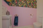 White suite comprising low flush W/C. Vanity style sink unit with mixer taps. Wood paneling. Tiled flooring.