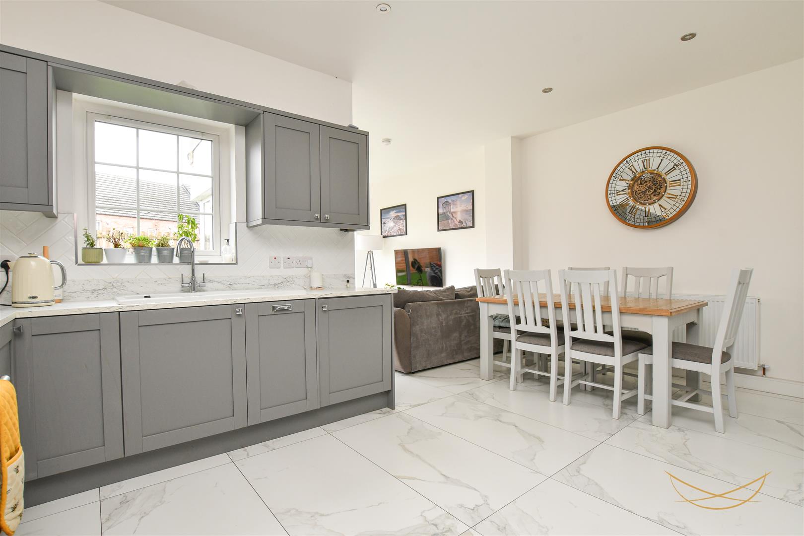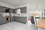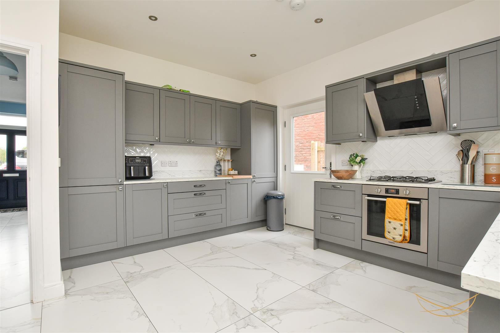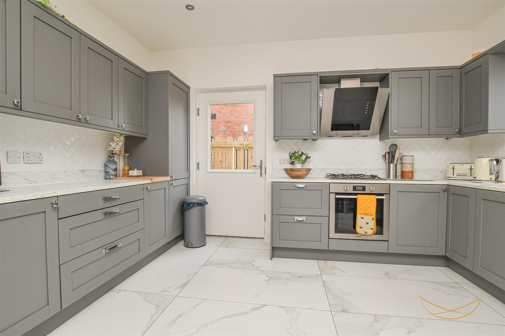 Shaker style kitchen with a range of high and low level units, contrasting formica worktops with matching upstand. Composite 1.5 sink bowl unit with drainer and mixer taps. Stainless steel angled extractor fan. Integrated gas hob. Integrated electric oven. Integrated fridge freezer. Integrated dishwasher. Tiled flooring. Access to rear garden. Recessed spotlights.