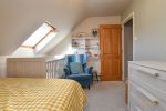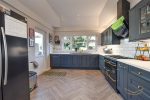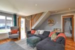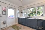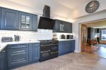 Contemporary shaker style kitchen with a range of high and low level units, contrasting formica worktops. Composite 1.5 sink bowl unit with drainer and mixer taps. Space for range style cooker. Integrated extractor fan. Integrated dishwasher. LVT herringbone flooring. Tiled splashback. Vaulted ceiling with recessed spotlights. Access to rear garden.