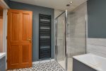 White suite comprising paneled bath with mixer taps hand held shower. Low flush W/C. Vanity style sink unit with mixer taps. Fully enclosed rainfall shower. Heated towel rail. Tiled flooring. Tiled walls. Recessed spotlights.