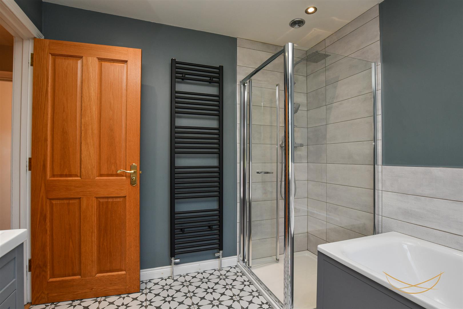 White suite comprising fully enclosed rainfall shower. Low flush W/C. Vanity style sink unit with mixer taps. Feature recessed shelving. Vertical radiator. Tiled flooring. Tiled walls. Recessed spotlights.