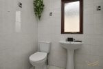 White suite comprising mains open shower unit. Low flush W/C. Pedestal wash hand basin with mixer taps. Tiled flooring. Tiled walls. Recessed spotlights.