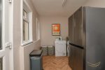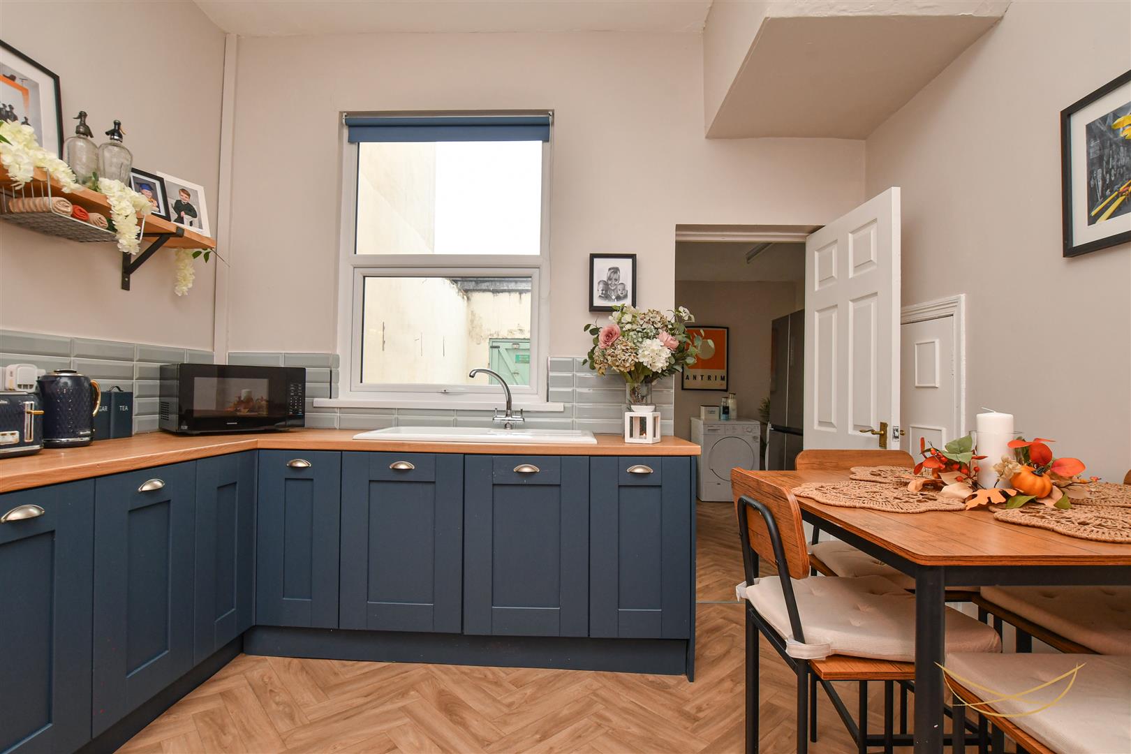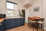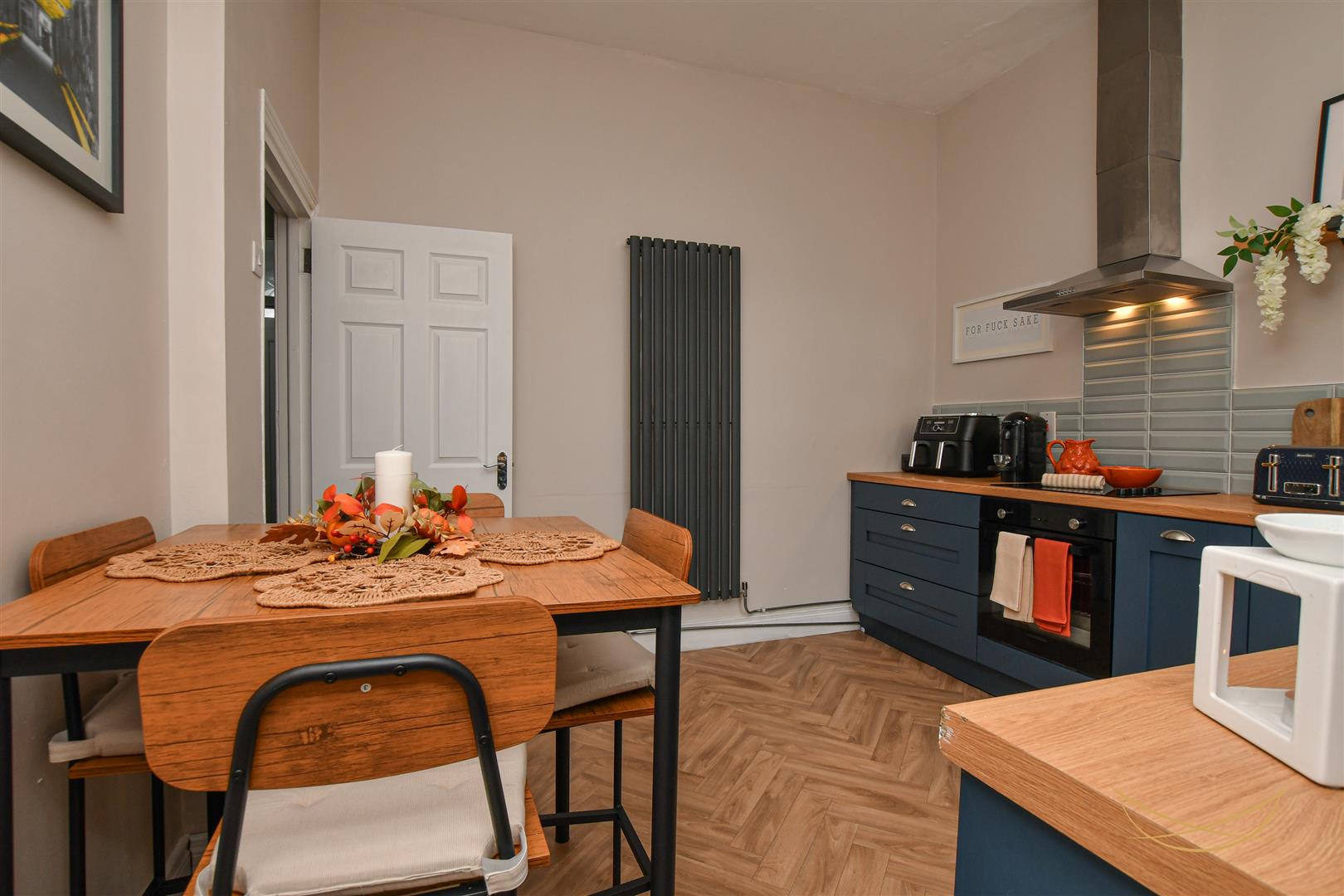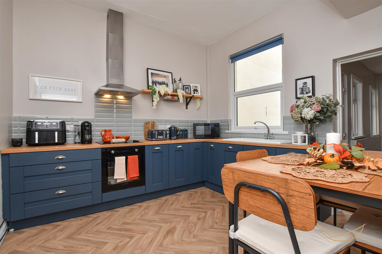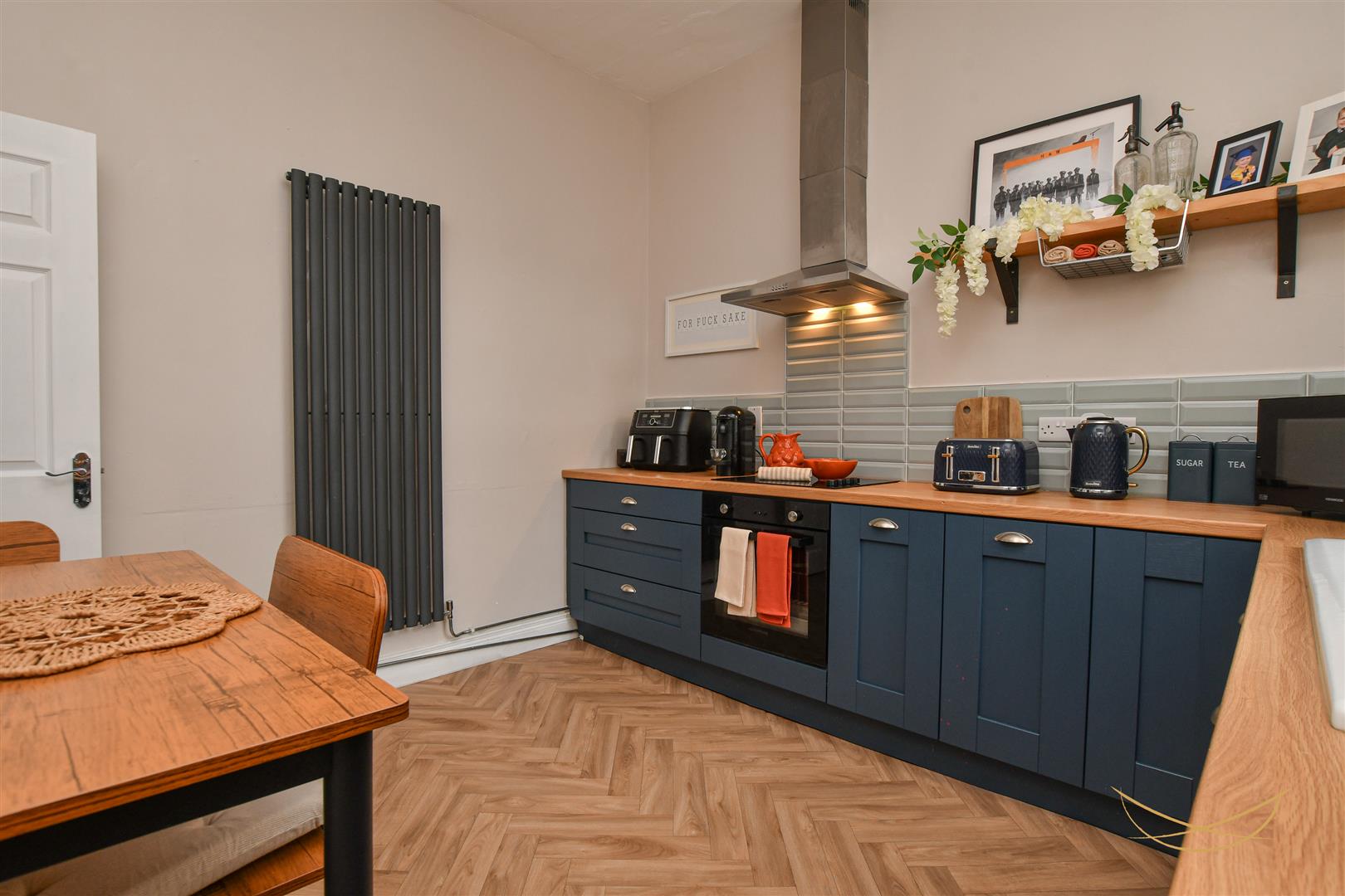 Range of low level units with contrasting worktops. Composite sink unit with drainer and mixer taps. Integrated electric oven and hob. Integrated extractor fan. Tiled splashback. Vinyl flooring. Feature vertical radiator. Access to storage.