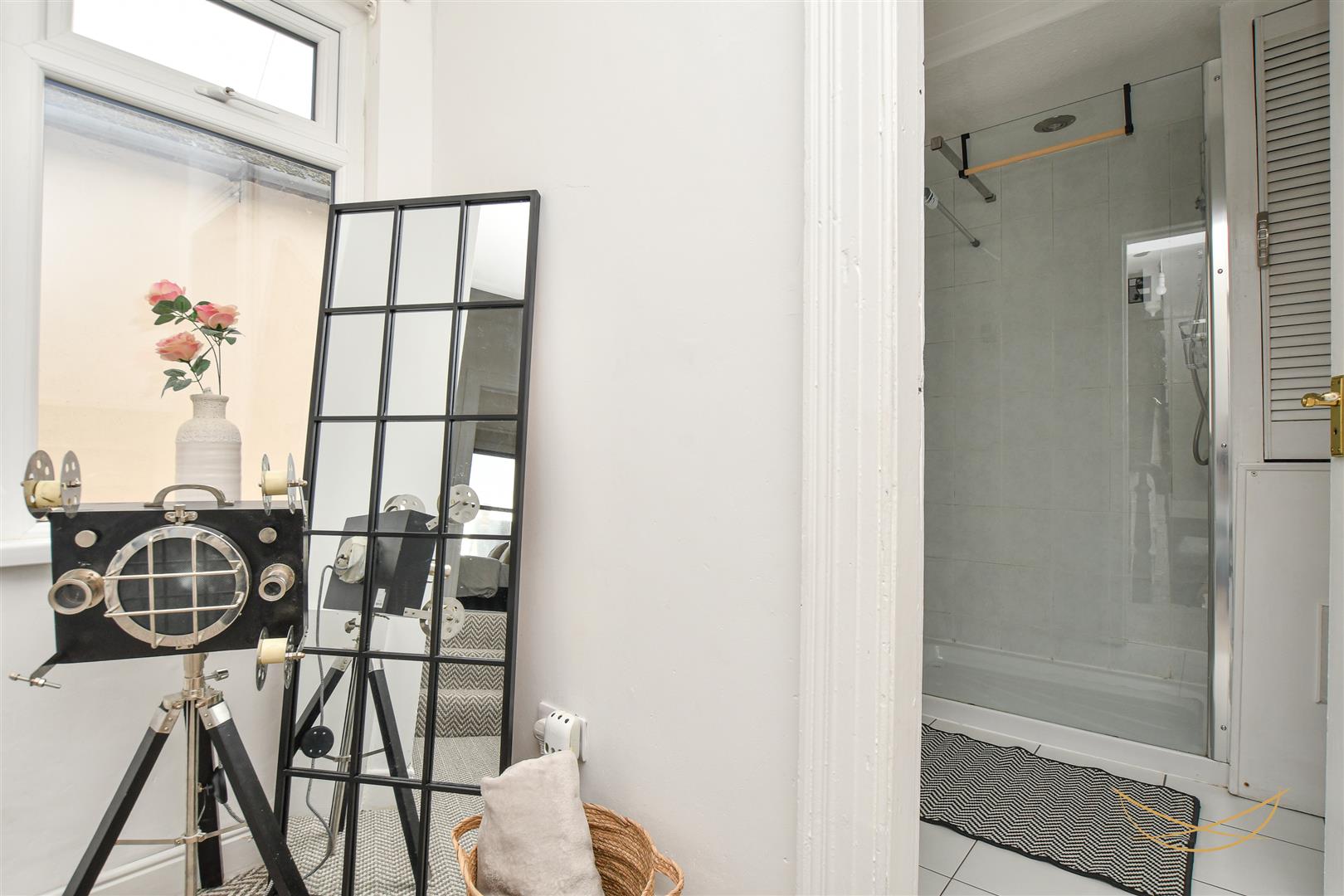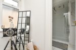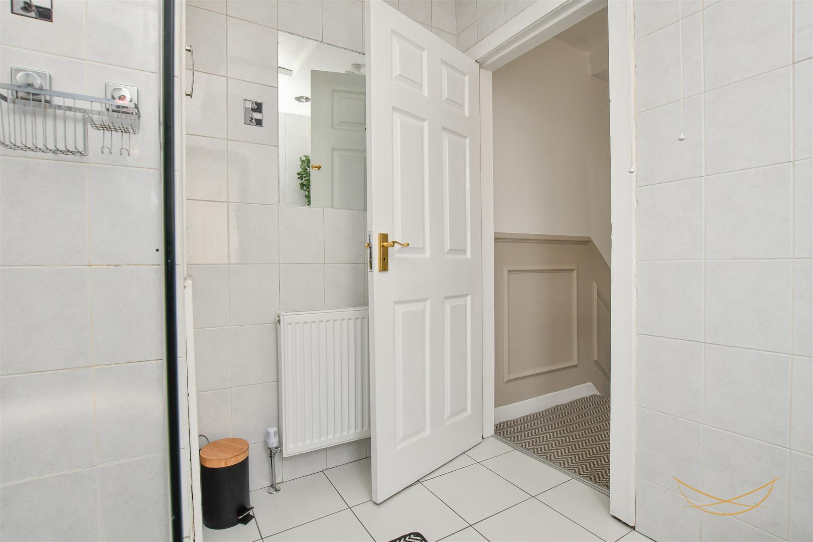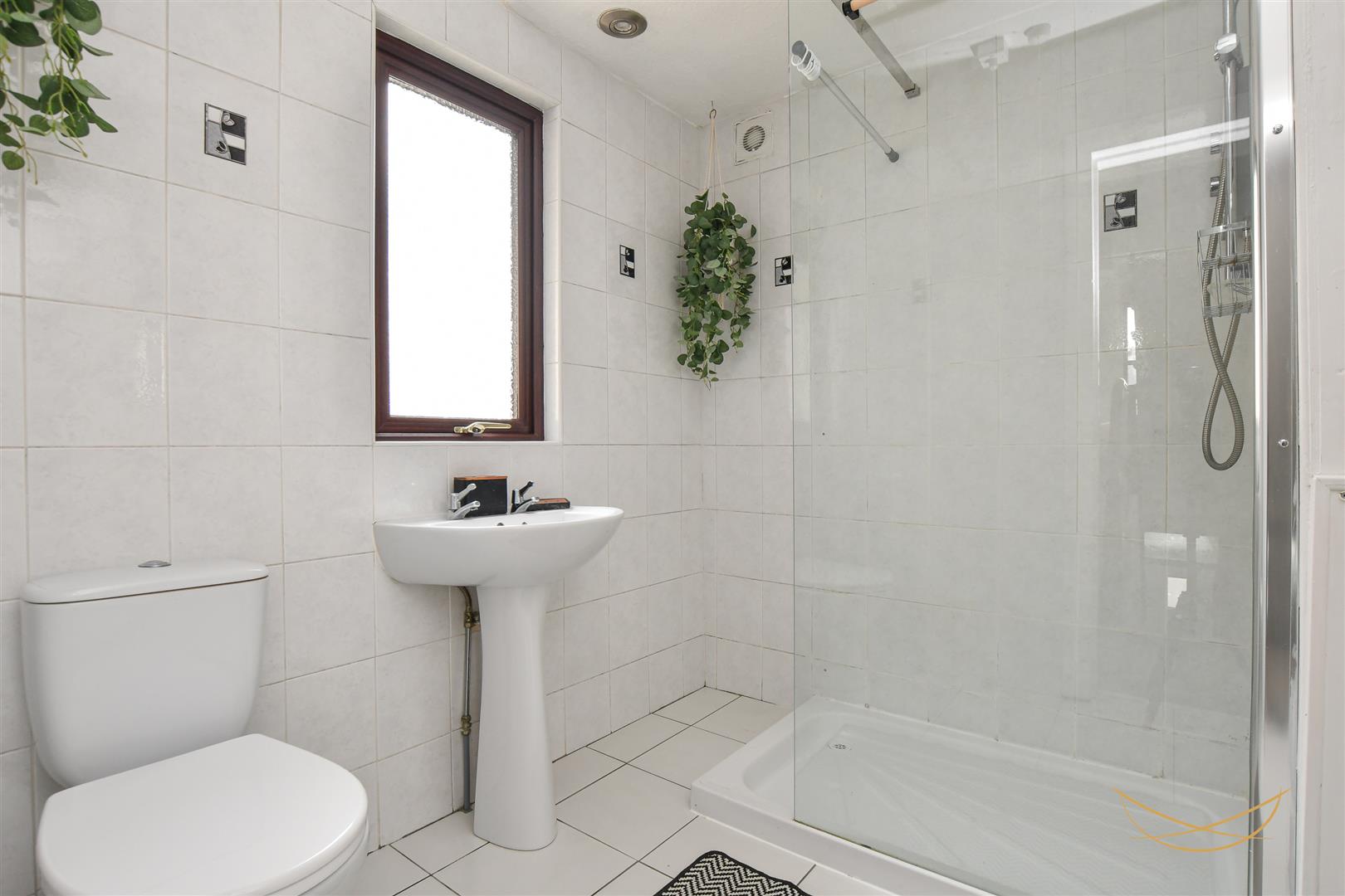 White suite comprising mains open shower unit. Low flush W/C. Pedestal wash hand basin with mixer taps. Tiled flooring. Tiled walls. Recessed spotlights.