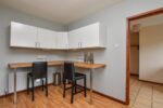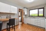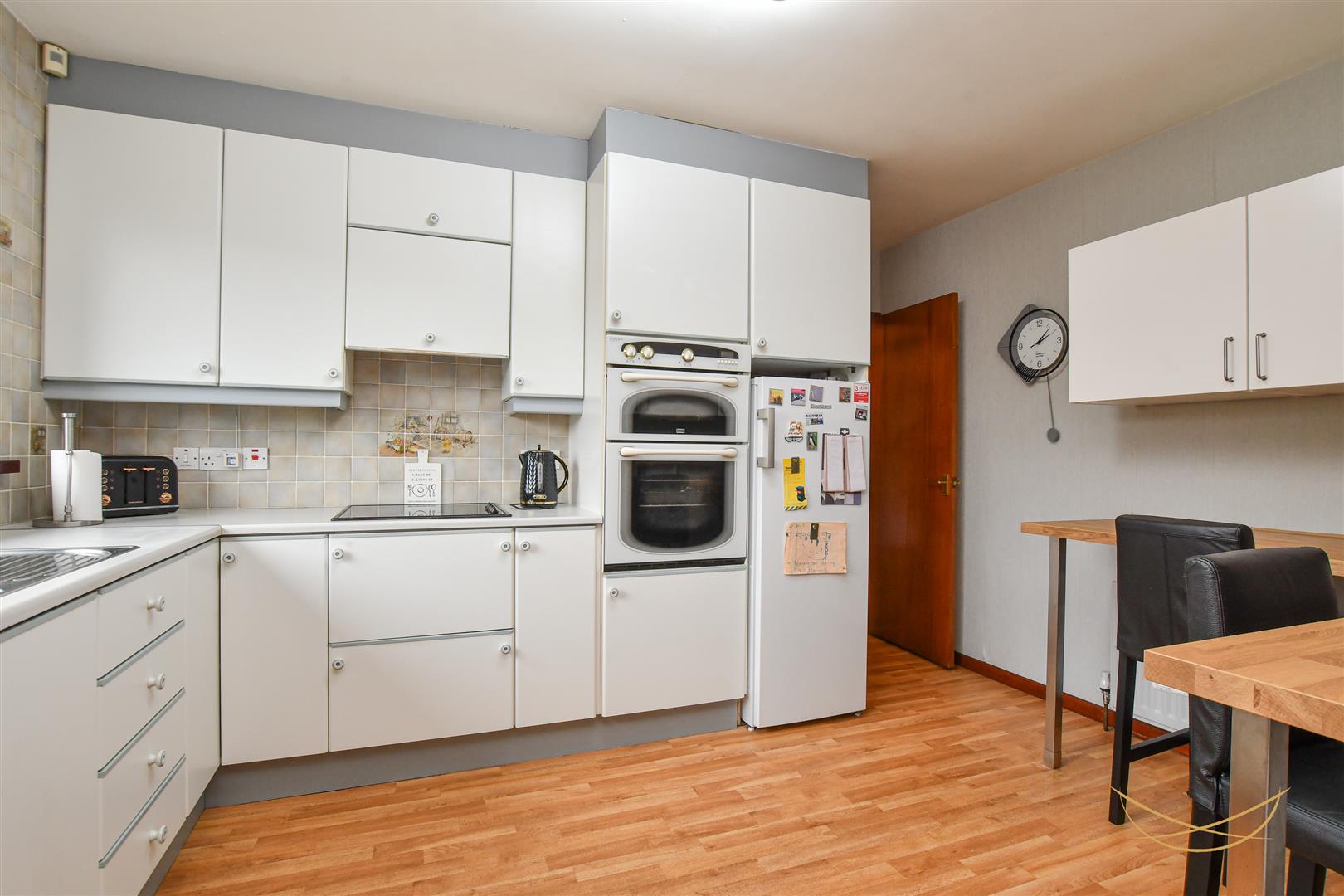 Range of high and low level units with contrasting formica worktops. Integrated eye level oven and grill. Integrated electric hob. Integrated extractor fan. Space for a fridge freezer. Space for dishwasher. Stainless steel 1.5 sink bowl unit with drainer and mixer taps. Breakfast bar area. Tiled splashback. Laminate wood effect flooring.