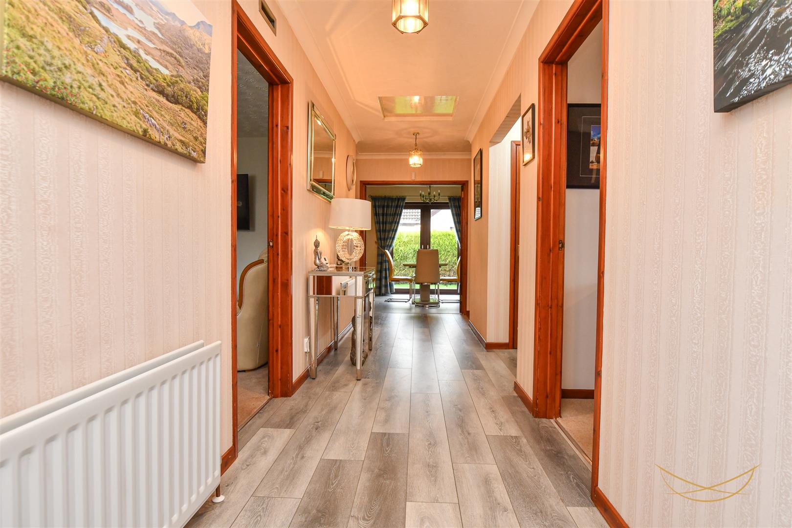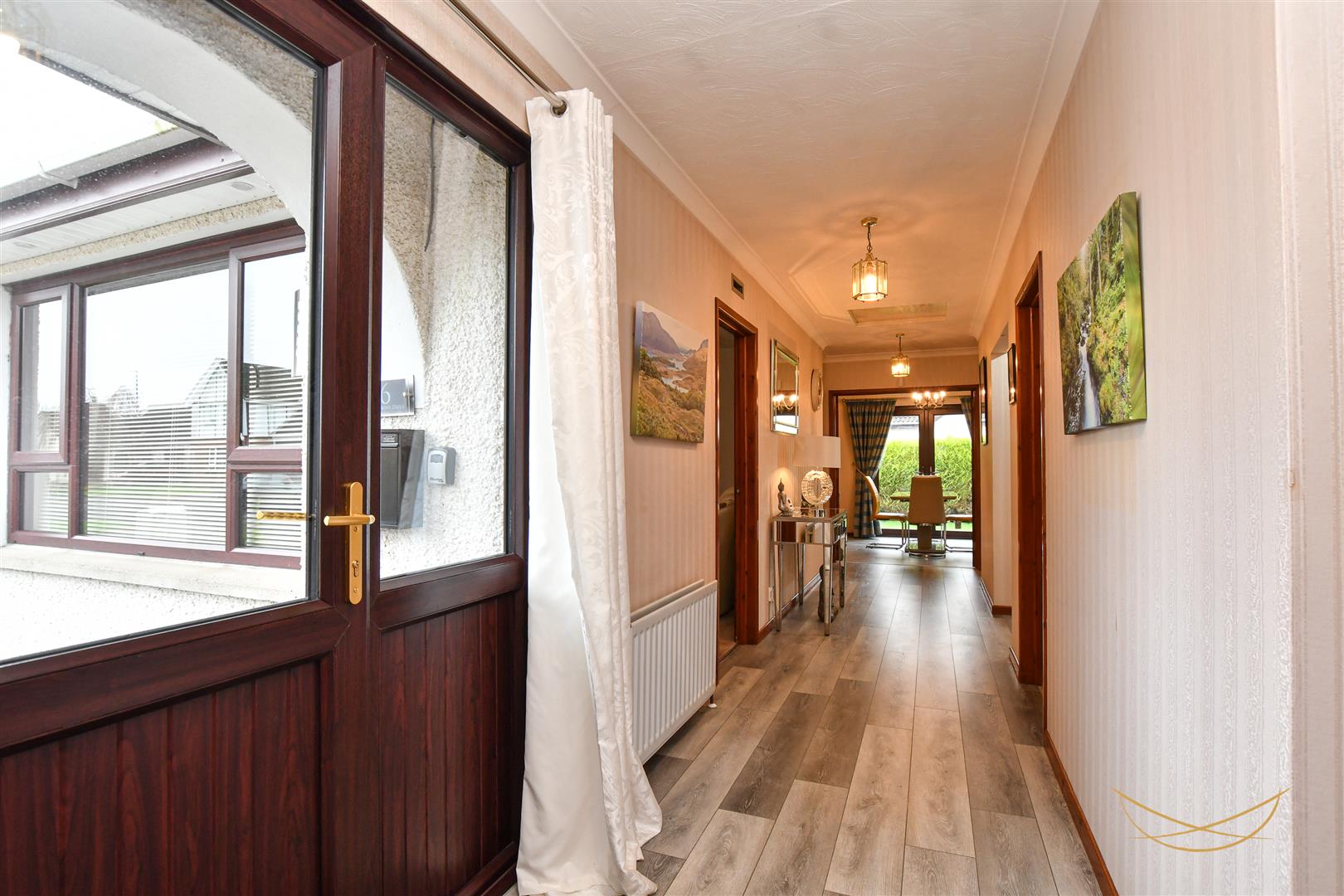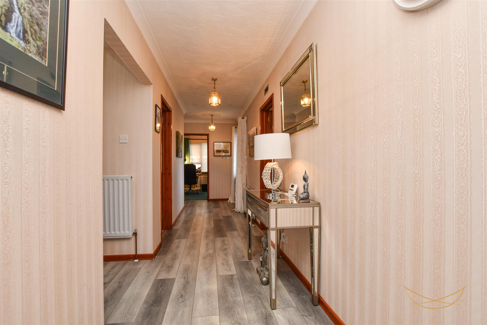 uPVC front door with feature glazed inset and side panels. Laminate wood effect flooring. Cornice ceiling. Access to storage.