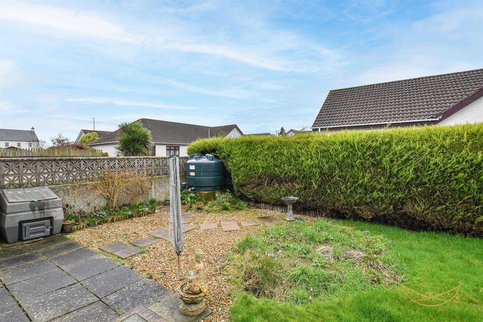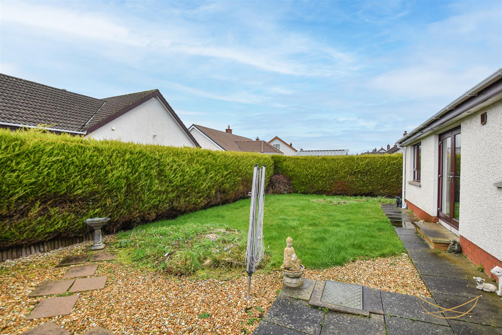 Front and rear laid in lawn bordered by mature shrubbery. Flower beds. Feature paving and stonework. Outdoor tap. Outdoor lighting.