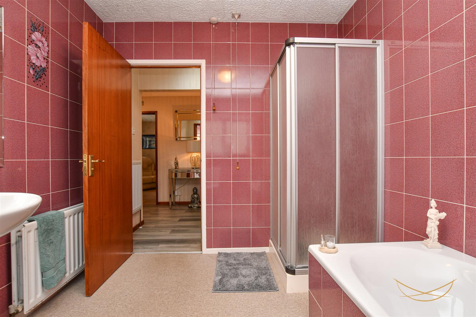 White suite comprising tiled bath with mixer taps. Pedestal wash hand basin with mixer taps. Low flush W/C. Fully enclosed mains shower. Tiled walls.