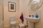 White suite comprising fully enclosed shower unit. Pedestal wash hand basin with mixer taps. Low flush W/C. Tiled flooring. Tiled splashback.