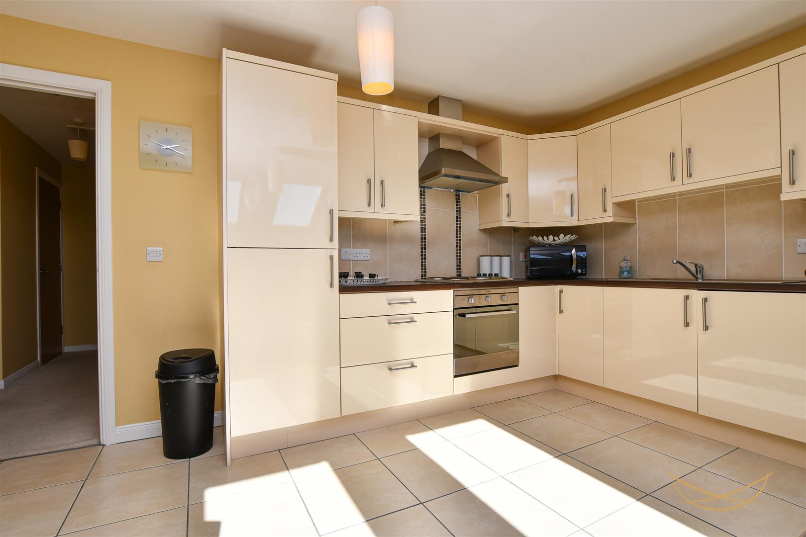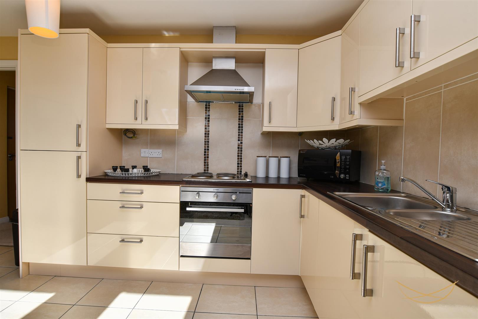 Range of high and low level units with contrasting worktops. 1.5 bowl sink unit with drainer and mixer taps. Integrated electric oven and hob. Integrated extractor fan. Integrated fridge freezer. Tiled splashback. Tiled flooring in kitchen area.