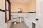 White suite comprising a paneled bath. Low flush W/C. Pedestal wash hand basin. Partially tiled walls.