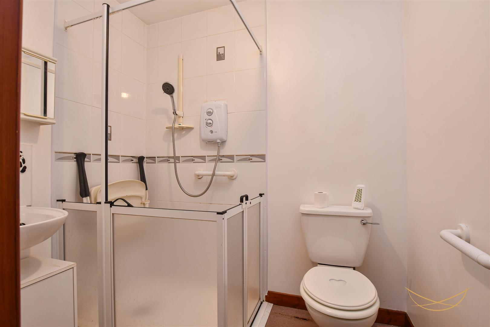 White suite comprising electric shower. Low flush W/C. Pedestal wash hand basin with mixer taps. Tiled splashback.
