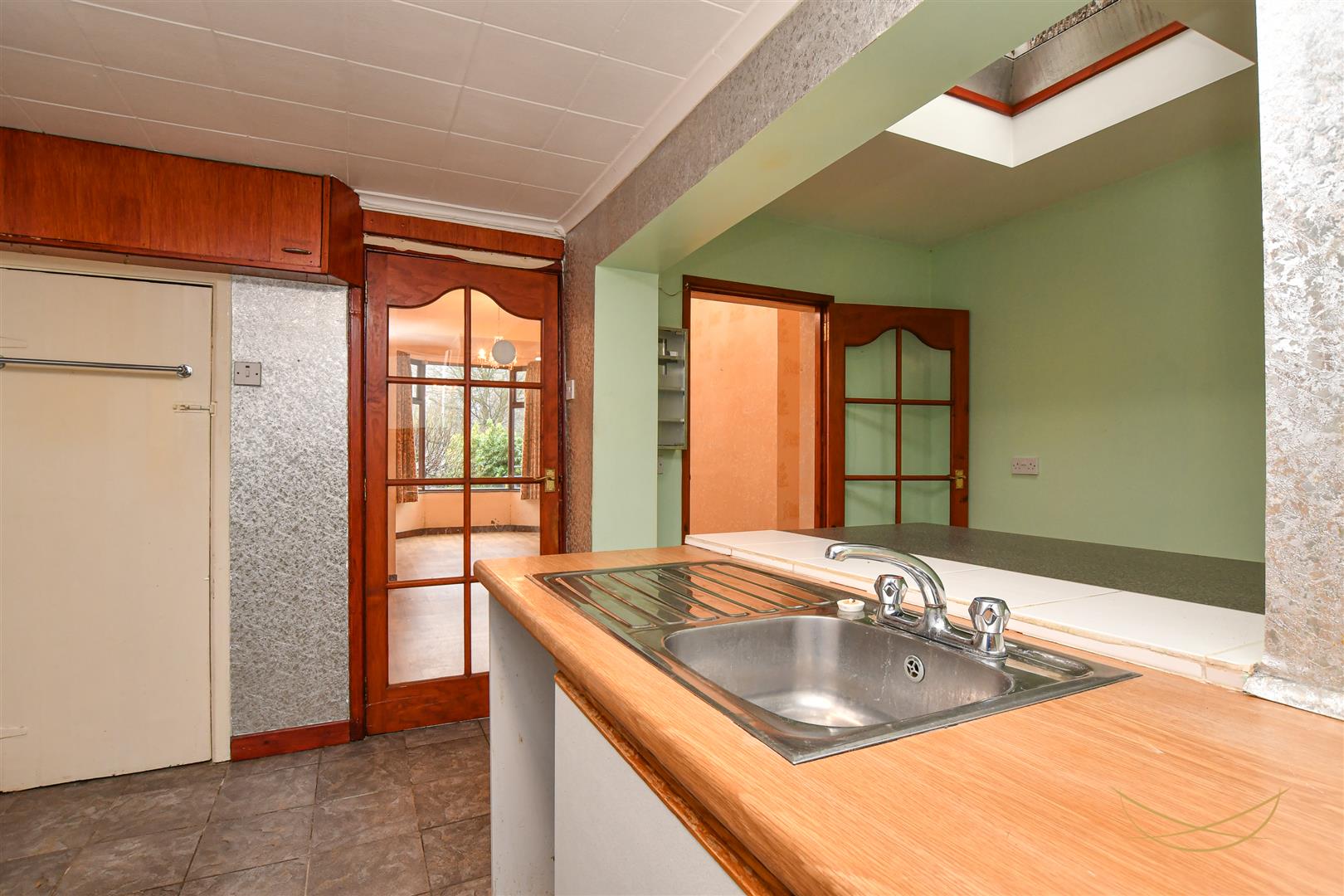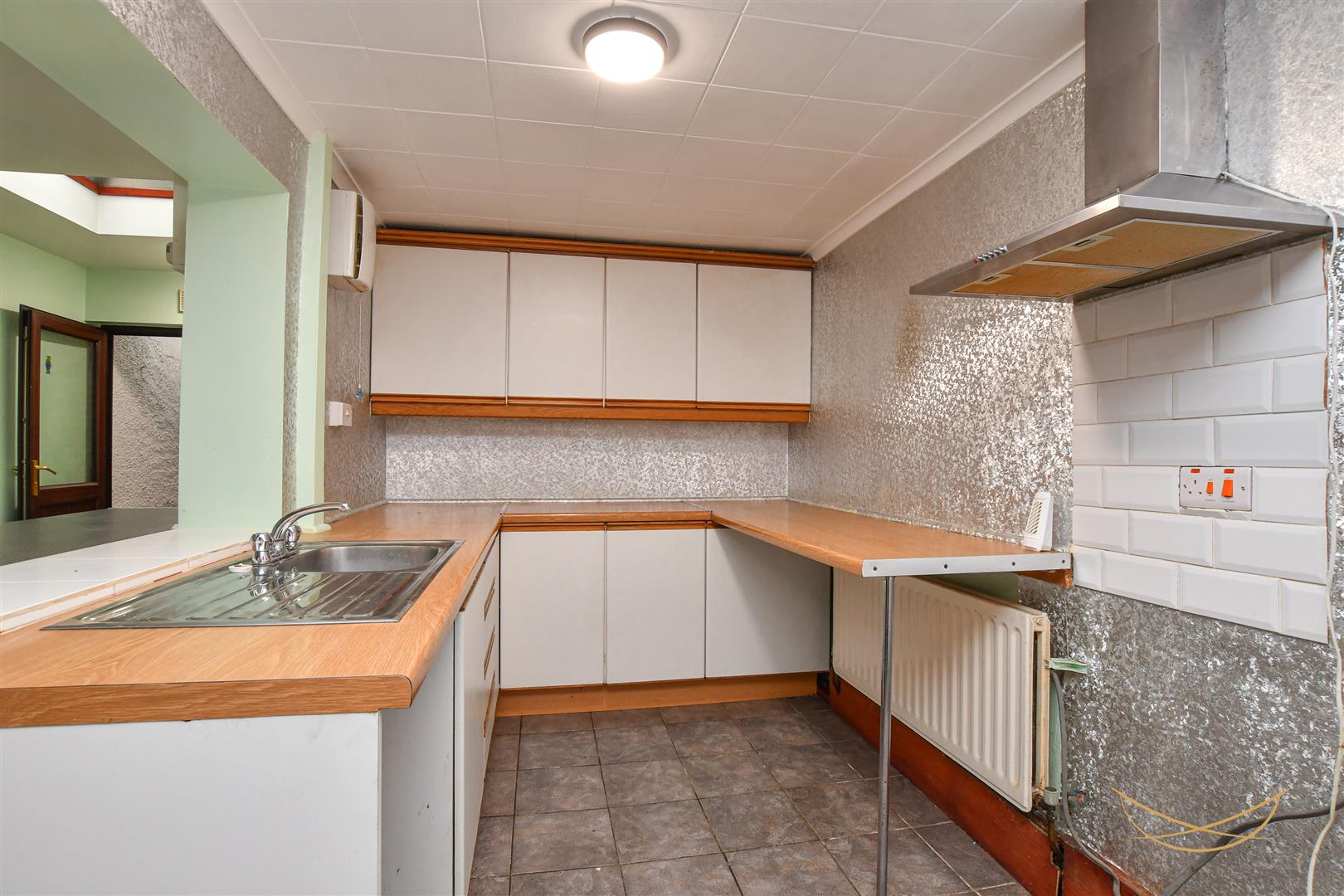 Range of high and low units with contrasting formica worktops. Stainless steel sink unit with drainer and mixer taps. Space for cooker. Stainless sink extractor fan. Space for washing machine. Tiled flooring. Breakfast bar area.