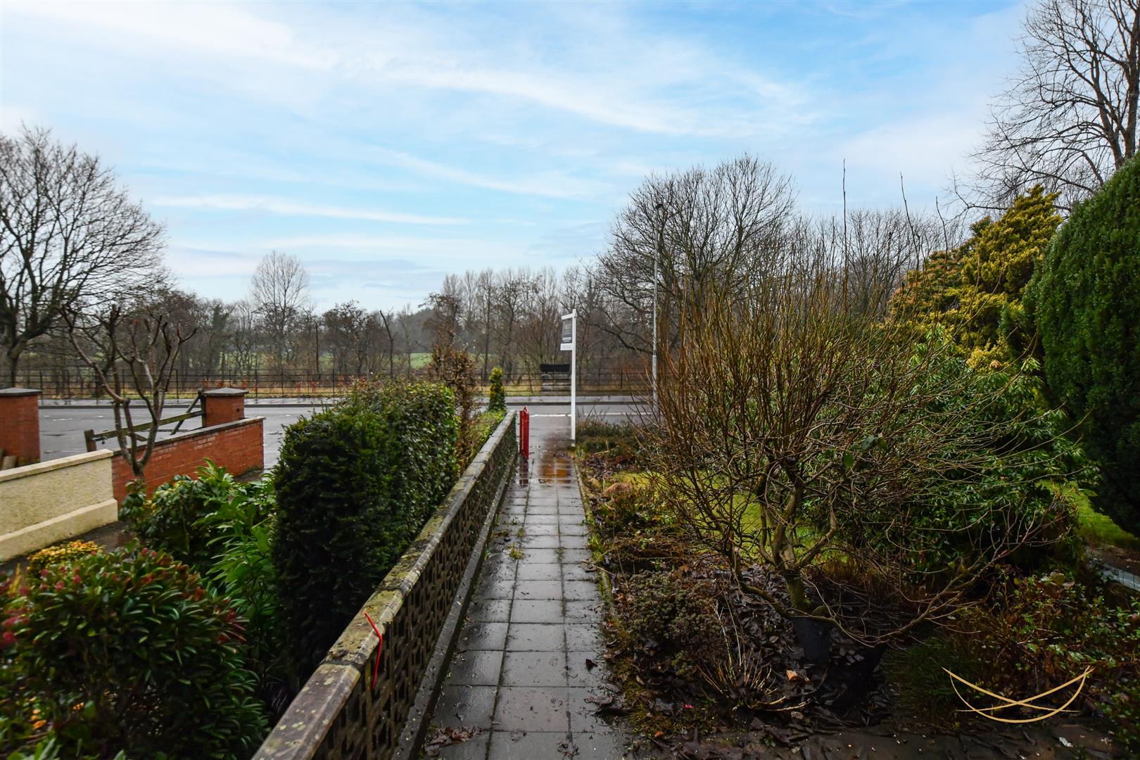 Front garden with laid in lawns bordered by mature shrubbery.