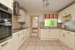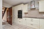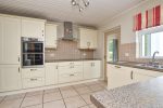Range of high and low level shaker style units recently contrasting formica worktops. 1 1/2 stainless steel sink unit. Tiled splashback. Integrated eye level double oven, fridge freezer, dishwasher, ceramic hob and overhead stainless steel extractor fan. Integrated space saving pull- out table offers extra space and worktop space. Clad ceiling. Tiled flooring.