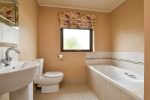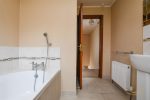 Three piece family bathroom suite, panelled bath with overhead shower unit. Low flush w/c. Pedestal sink unit with chrome mixer taps. Tiled splashback. Ceramic tiled flooring.