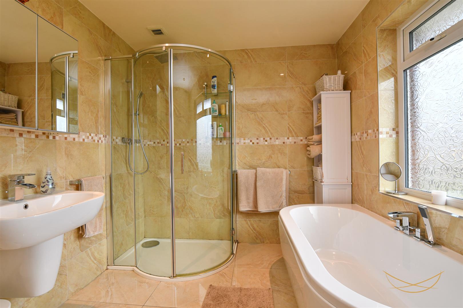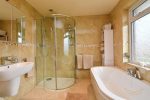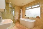 White four piece suite comprising paneled bath with mixer taps and hand held shower. Fully enclosed mains shower unit. Semi pedestal wash hand basin with mixer taps. Tiled flooring. Tiled walls. Recessed spotlights.