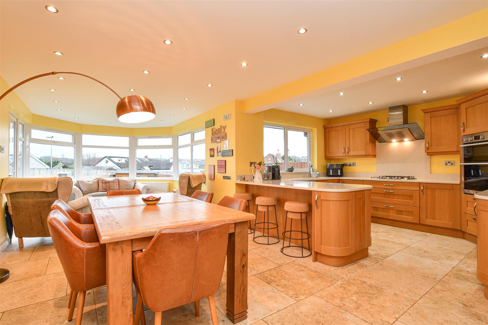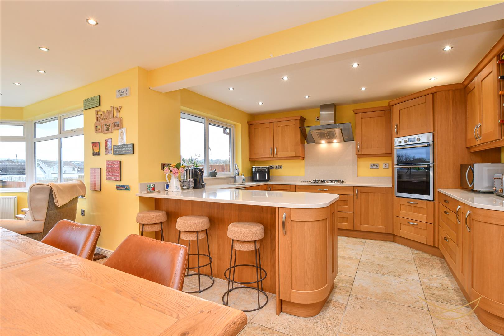 Range of high and low level units with contrasting quartz worktops and matching upstand. Stainless steel 1.5 sink bowl unit. Quooker boiling tap. Four ring gas hob. Splashback. Space for dishwasher. Integrated Hotpoint eye level electric oven and hob. Breakfast bar area. Wine rack display. Tiled flooring. Recessed LED spotlights.