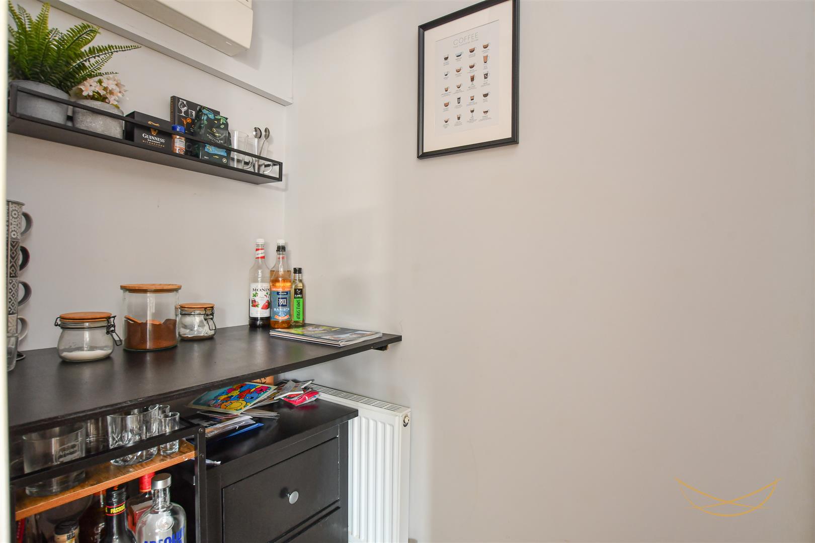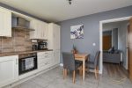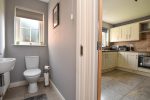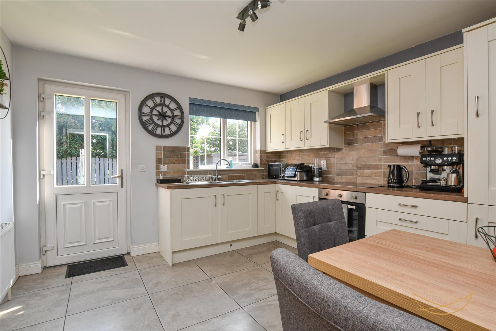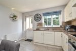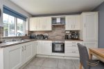 Range of high and low shaker style units with contrasting formica worktops. Recessed triglo plinth spotlights. 1 1/2 chrome bowl sink unit with drainer and chrome mixer tap. Tiled splashback. Integrated oven and grill with four ring electric hob. Overhead extractor fan. Integrated fridge freezer. Ceramic tiled flooring. uPVC rear door with glazed insets.
