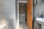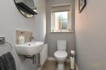 Low flush w/c. Floating pedestal sink with chrome mixer tap. Tiled splashback.