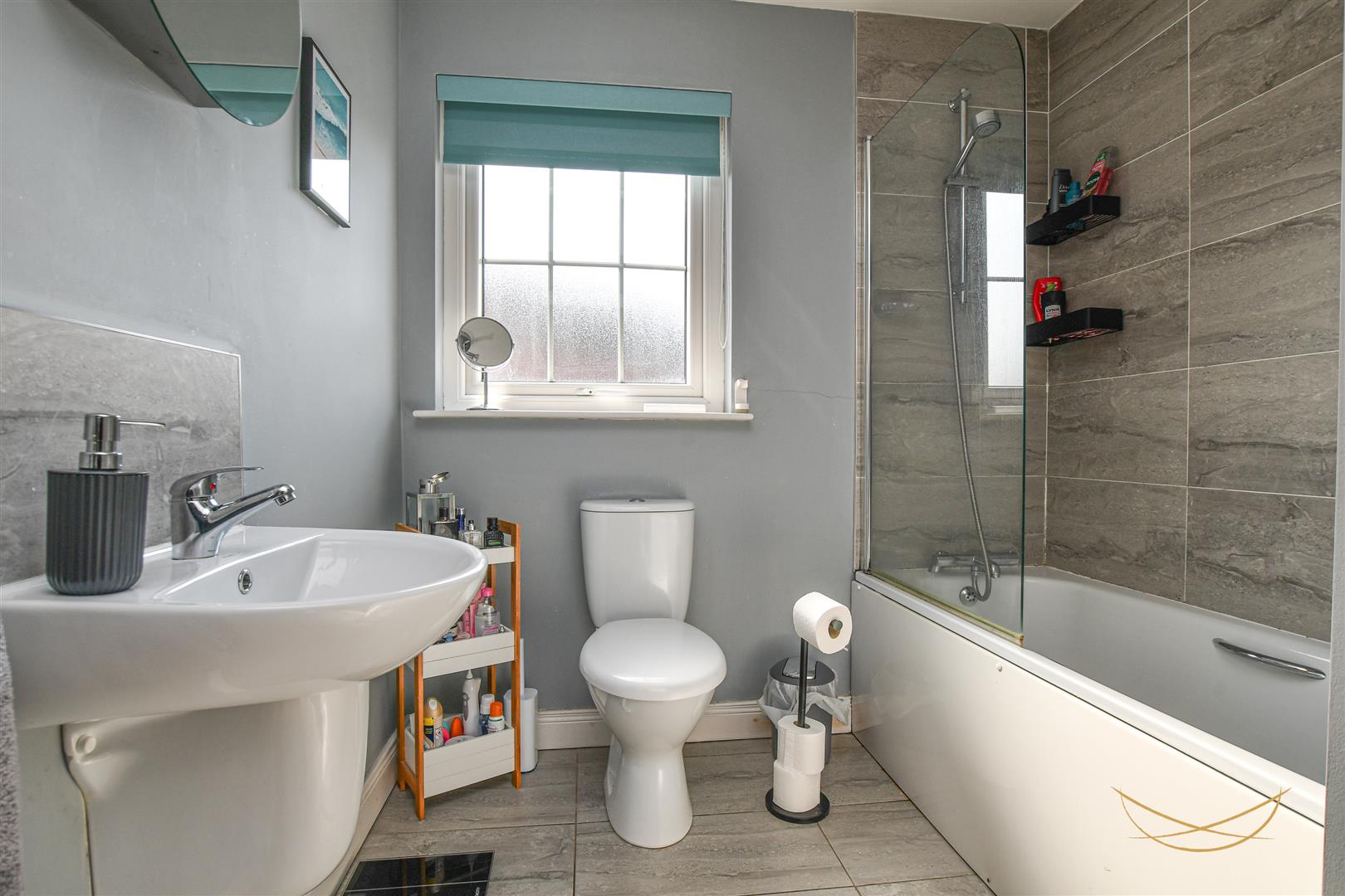 Three piece bathroom suite compromising of panelled bath with overhead chrome shower. Half-pedestal sink with chrome mixer tap. Tiled splashback, partially tiled walls.