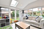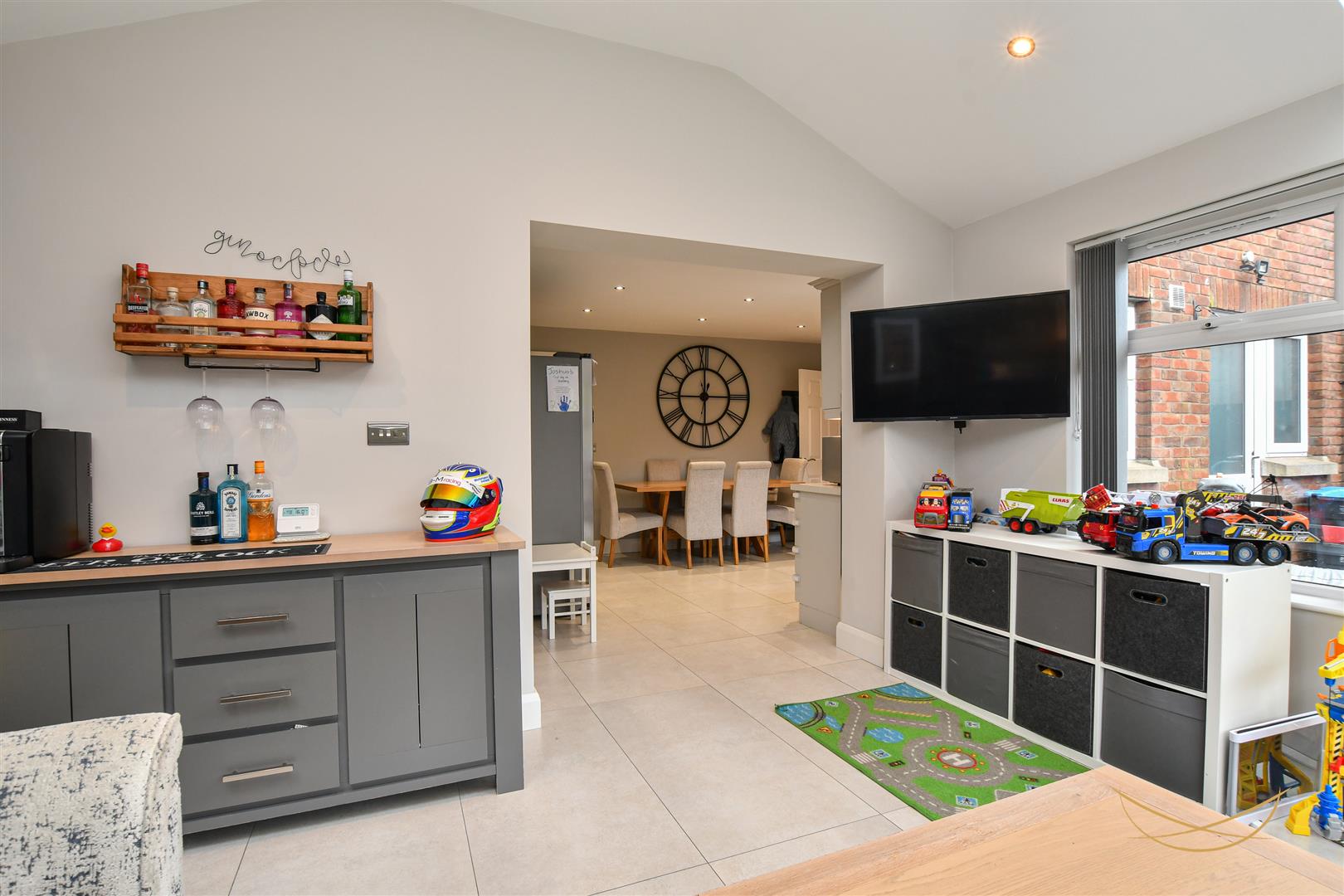 Vaulted ceiling with recessed spotlights. Double patio doors leading to rear garden. Tiled flooring.