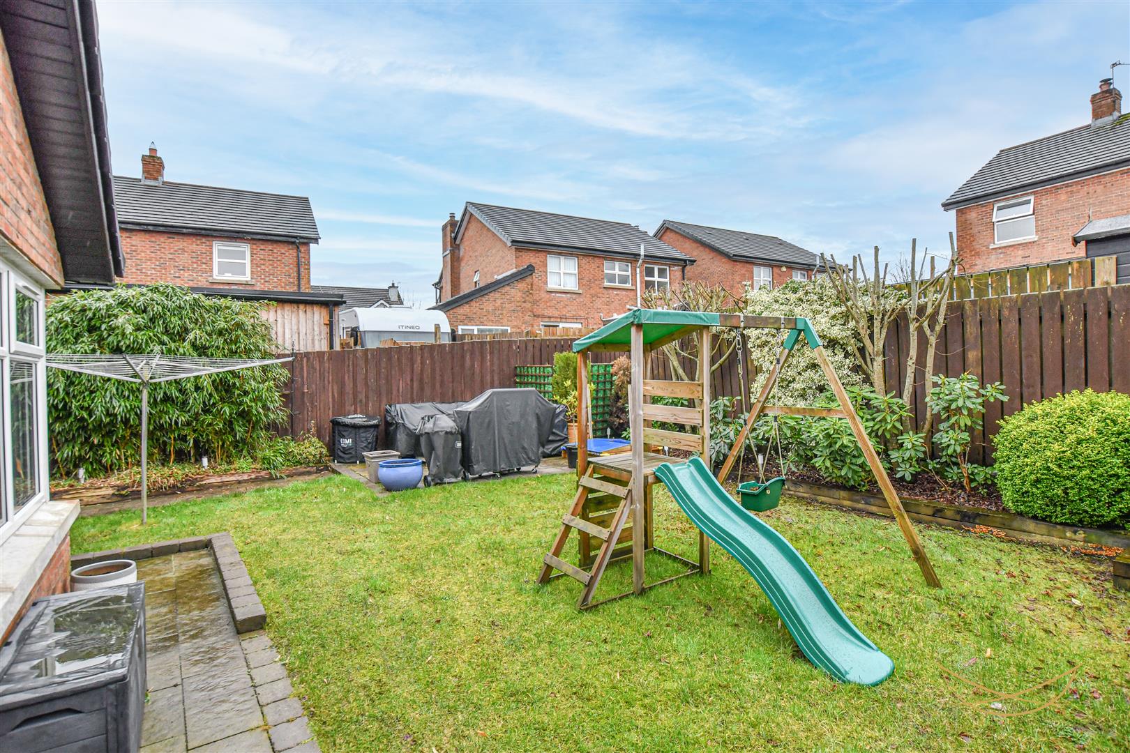 Rear laid in lawn bordered by mature shrubbery. Feature paving. Outdoor tap. Outdoor lighting.
