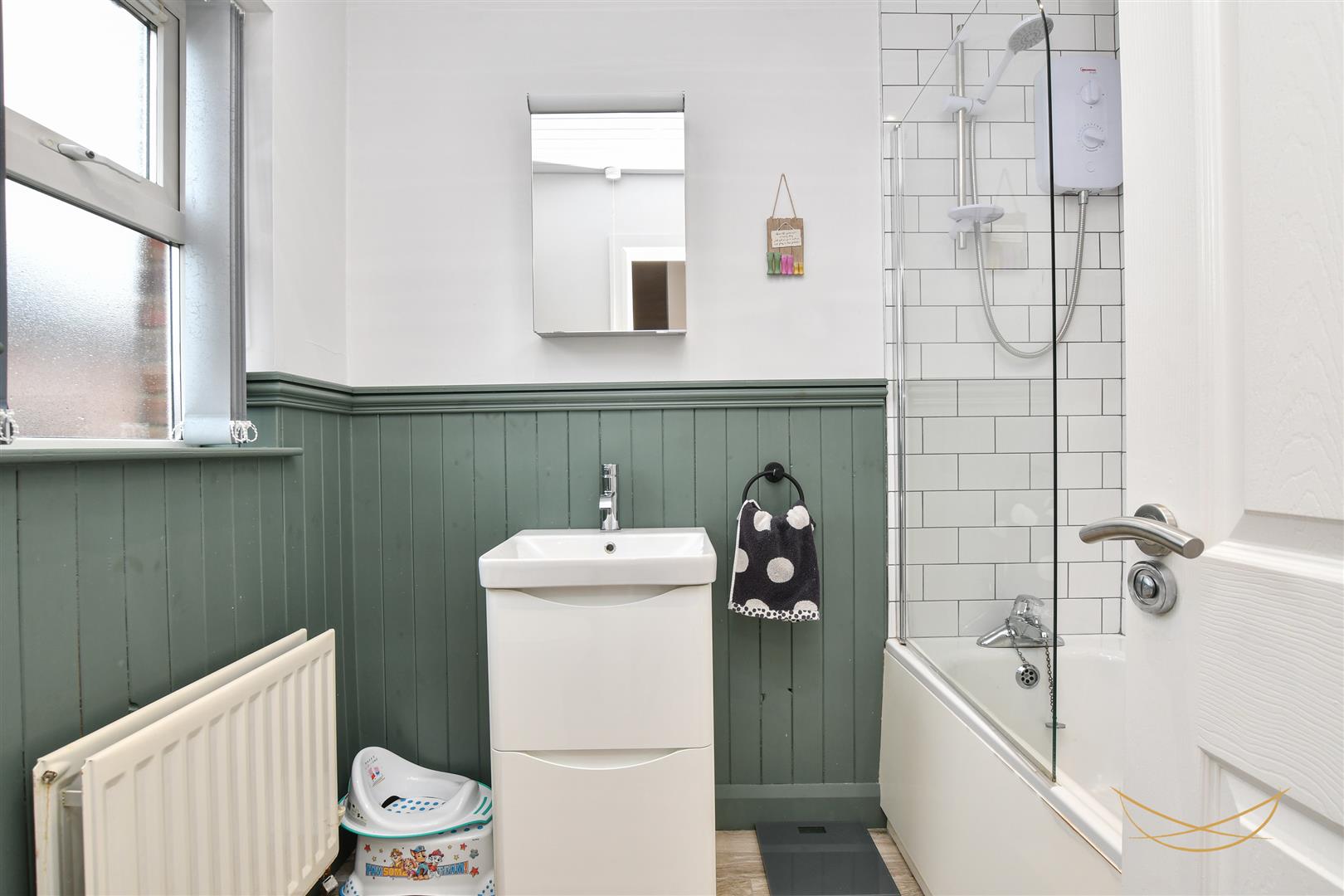 White suite comprising corner electric shower. Low flush W/C. Vanity style sink unit with mixer taps. Tiled walls. Tiled flooring.