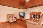 Five piece suite comprising low flush w/c, traditional pedestal sink with chrome taps, freestanding bath with Milano Elizabeth Traditional Crosshead telephone shower attachment. Enclosed shower unit. Fully tiled walls with mosaic boarder. Tile effect flooring. Wood cladding ceiling with recessed spotlights.