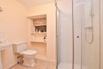 Three piece suite comprising low flush w/c, traditional pedestal sink with chrome taps and fully tiled shower enclosure. Vinyl flooring.