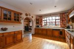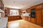 Range of high and low level units with contrasting corian worktops. Stainless steel 1.5 bowl sink unit with mixer taps. Integrated electrical Neff hob. Integrated extractor fan. Integrated eye level oven. Integrated microwave. Integrated dishwasher. Integrated fridge. Glazed display cabinets. Engineered wood flooring. Tiled splashback. Recessed spotlights.