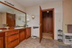 White suite comprising open mains shower. Low flush W/C. Double vanity style sink unit with mixer taps. Built in storage.