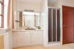 Cream suite comprising fully enclosed mains shower. Low flush W/C. Vanity style sink unit with mixer taps.
