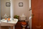 Low flush w/c. Pedestal sink. Partially tiled walls. Ceramic tiled flooring.